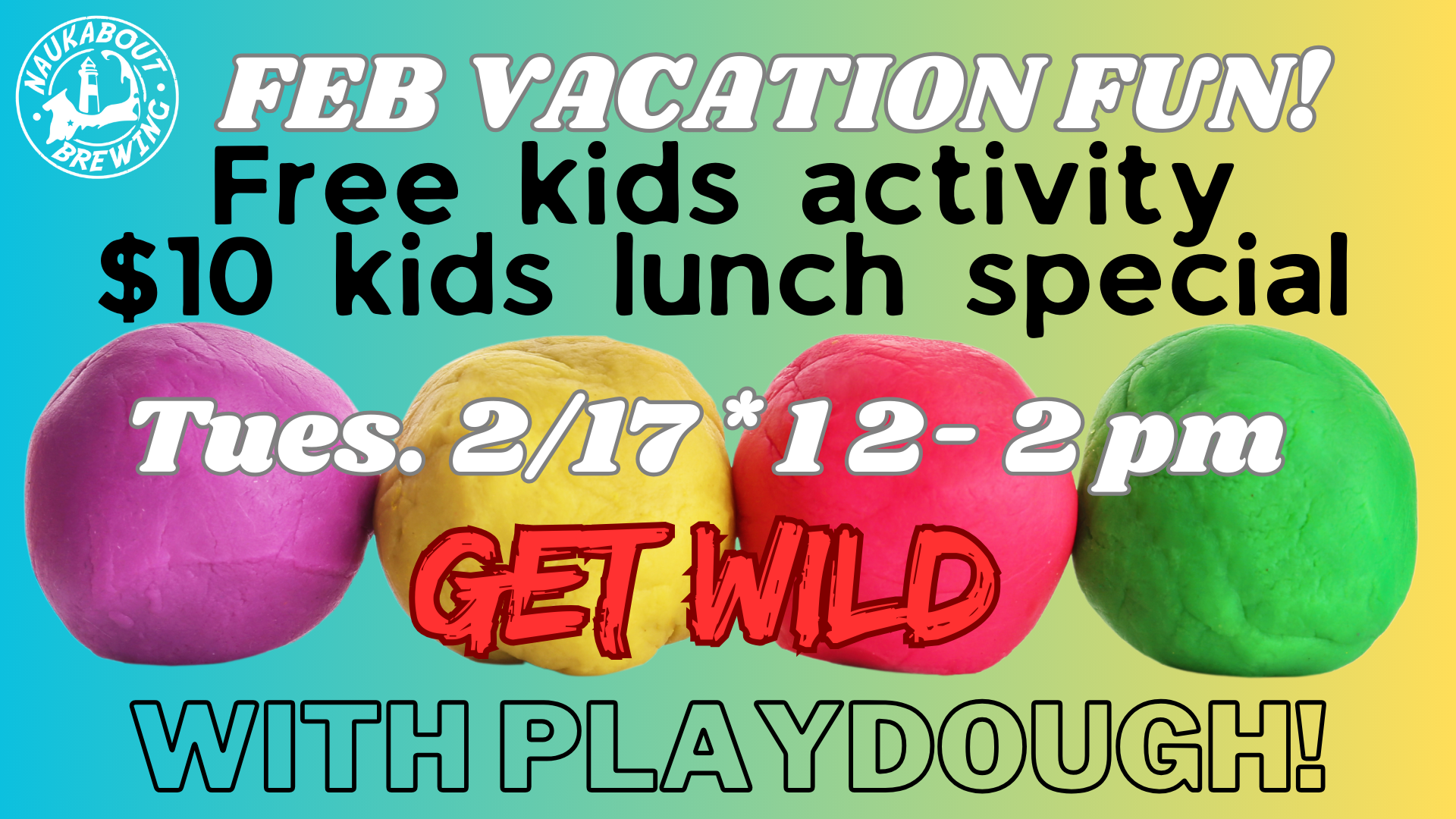 Naukabout Beer Co. (map) 13 Lake Avenue Mashpee, MA, 02649 United States ✚ gCal ✚ iCal Join us in the taproom to make the most out of February Vacation! Kids will enjoy a $10 lunch special and today we'll be exploring the wonderful world of playdough!