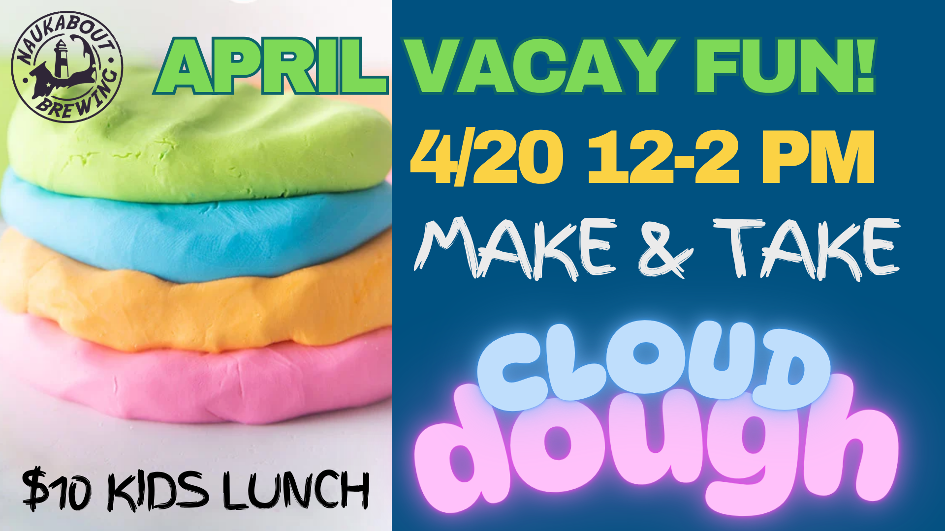 Naukabout Beer Co. (map) 13 Lake Avenue Mashpee, MA, 02649 United States ✚ gCal ✚ iCal Meet us in the taproom for some April STAYcation fun! Today’s Craft is: CLOUD DOUGH! $10 kids lunch SPECIAL (dine-line only)