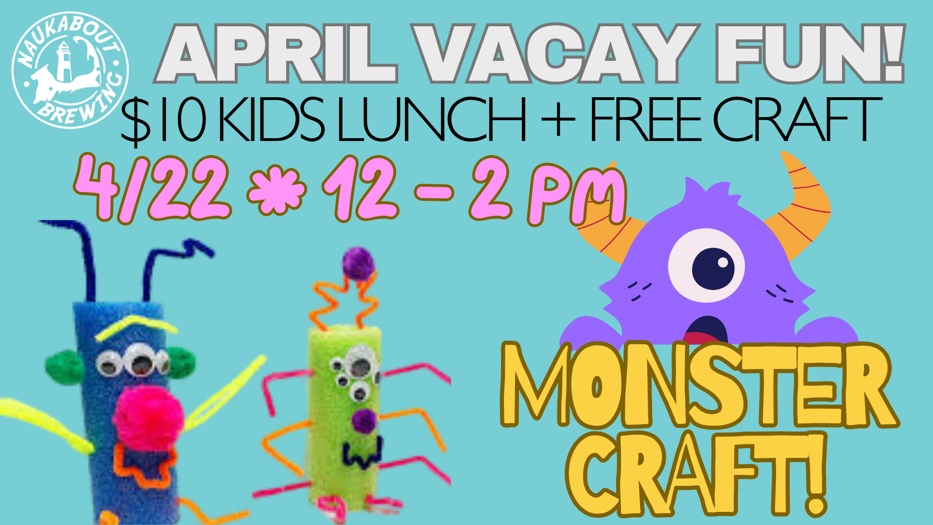 Naukabout Beer Co. (map) 13 Lake Avenue Mashpee, MA, 02649 United States ✚ gCal ✚ iCal Meet us in the taproom for some April STAYcation fun! Today’s Craft is: MONSTER FRIENDS!$10 kids lunch SPECIAL (dine-line only)