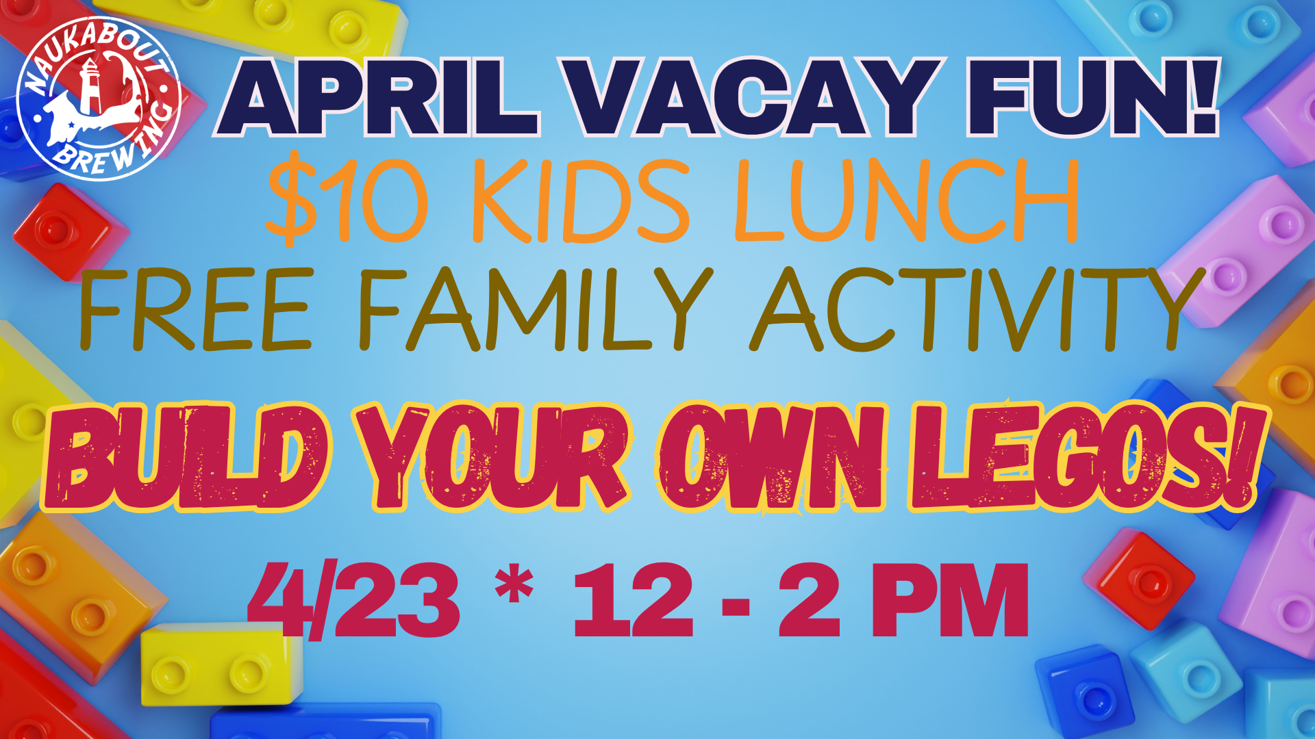 Naukabout Beer Co. (map) 13 Lake Avenue Mashpee, MA, 02649 United States ✚ gCal ✚ iCal Meet us in the taproom for some April STAYcation fun! Today’s FUN is: LEGOS! $10 kids lunch SPECIAL (dine-line only)